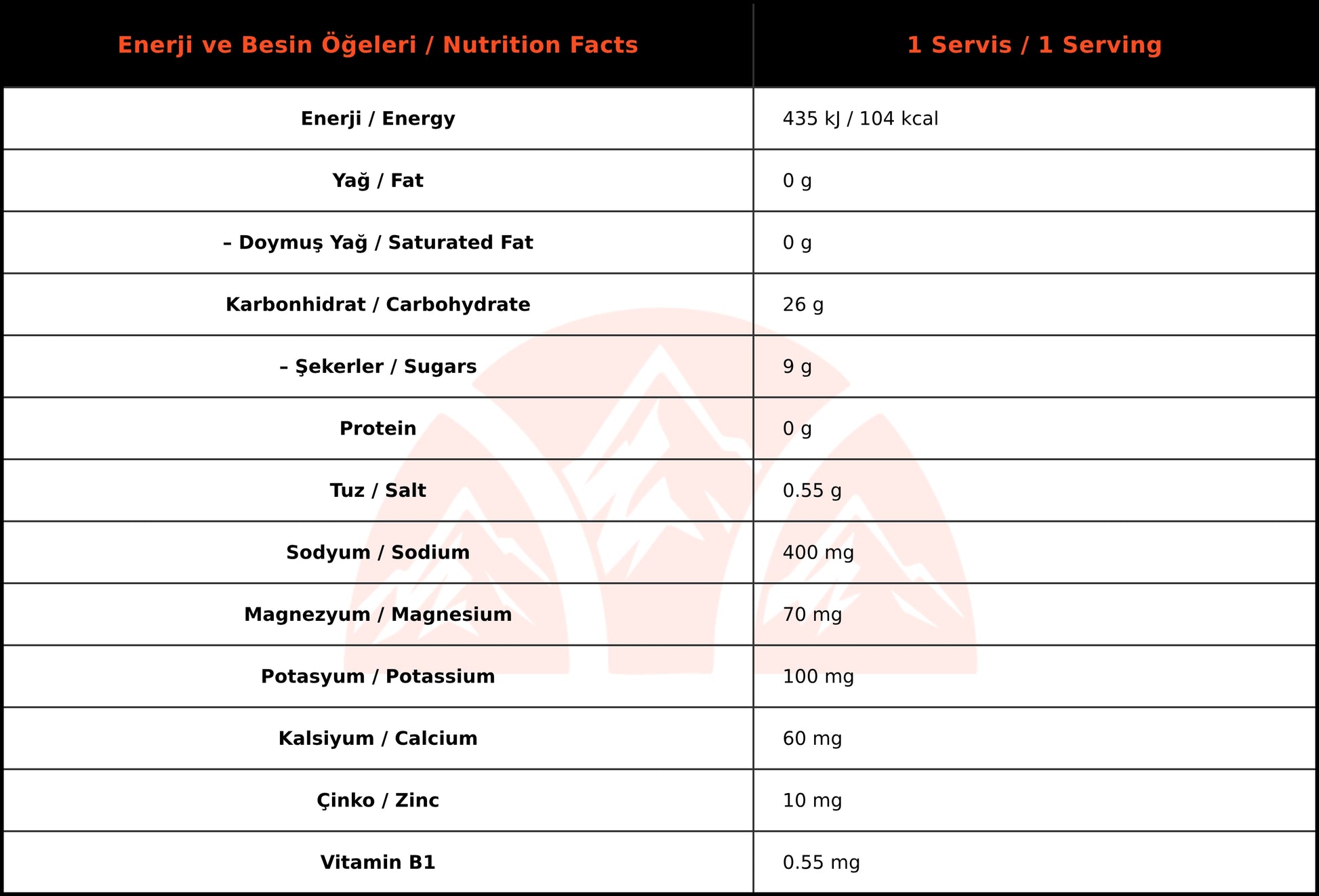 Maltodekstrin, Fruktoz, İzomaltuloz, Asitlik Düzenleyici (Sitrik Asit), Sodyum Bikarbonat (Sodyum), Sodyum Klorür (Sodyum Klorür), Magnezyum Sitrat (Magnezyum), Doğal Aroma Vericiler (Elma), Kalsiyum Laktat (Kalsiyum), Potasyum Sitrat (Potasyum), Çinko Sülfat (Çinko), Tatlandırıcı (Sukraloz), Renklendiriciler (Aspir Çiçeği, Bakır Klorofilin), Tiamin Mononitrat (B1 Vitamini)