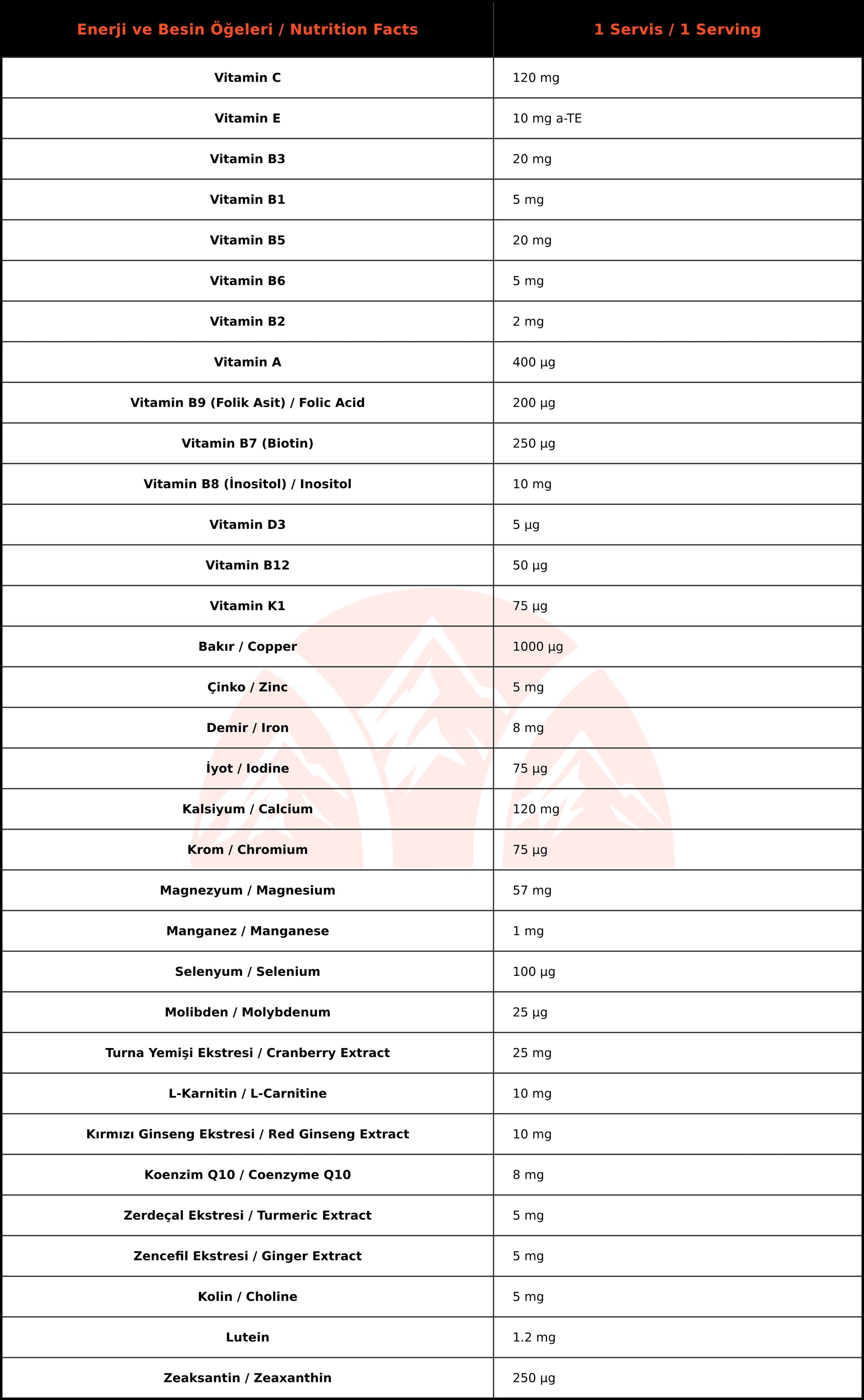 Kalsiyum Karbonat, L-Askorbik Asit, Bitkisel Kapsül (Hidroksipropil Metil Selüloz) Magnezyum Oksit, DL-alfa-Tokoferil Asetat, Turna Yemişi Ekstresi (Vaccinium macrocarpon Aiton), Ferroz Fumarat, D-Pantotenat Kalsiyum, Nikotinamid, Çinko Sülfat, L-Karnitin, Kırmızı Kore Ginsengi Ekstresi (Panax ginseng), İnositol, Koenzim Q10, Topaklanmayı Önleyiciler (Yağ Asitlerinin Magnezyum Tuzları, Silikon Dioksit), Tiamin Hidroklorür, Piridoksin Hidroklorür, Zerdeçal Ekstresi (Curcuma longa), Zence l Ekstresi (Zingiber of cinale), Üzüm Tohumu Ekstresi (Vitis vinifera), Kolin Klorür, Manganez Sülfat Monohidrat, Retinil Palmitat, Bakır Sülfat, Ribo avin, Kolekalsiferol, Lutein, Fillokuinon (Fitomenadion), Krom Pikolinat, Pteroilmonoglutamik Asit, D-Biotin, Zeaksantin, Sodyum Selenit, Potasyum İyodat, Sodyum Molibdat, Siyanokobalamin.