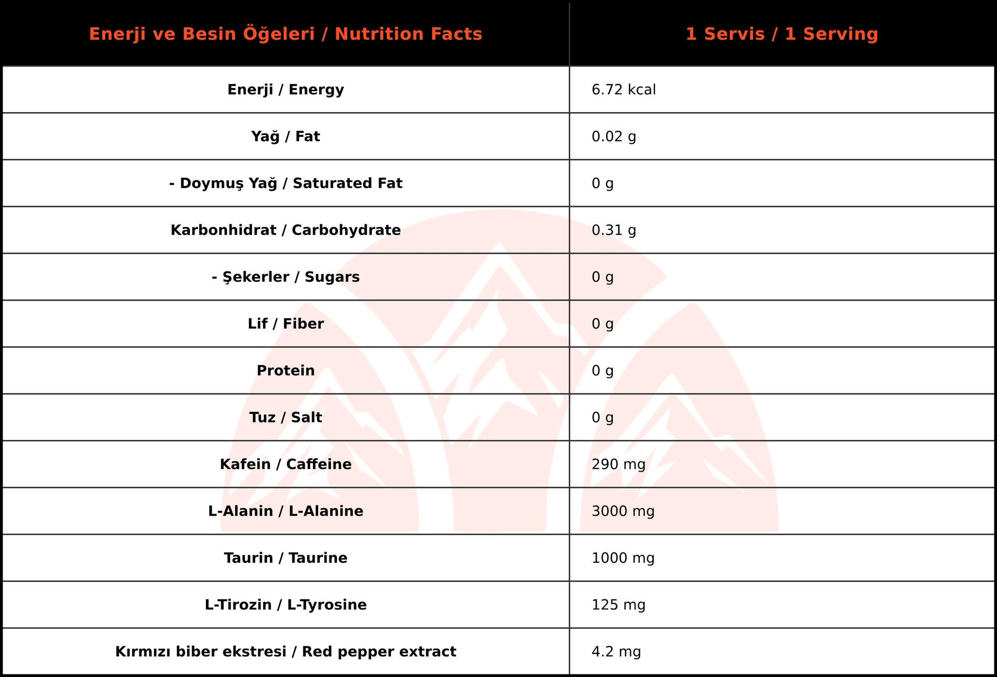 Su, L-alanin, asitlik düzenleyici: sodyum sitrat, sitrik asit, taurin, kafein, %0,675 aroma verici: portakal, L-tirozin, kıvam arttırıcı: sodyum karboksi metil selüloz, tatlandırıcılar: asesülfam K, sukraloz, siklamik asit ve sodyum ve kalsiyum tuzları, tuz, koruyucu: sorbik asit, kırmızı biber (Capsicum annuum L.), renklendiriciler: karoten, karmin, riboflavin.