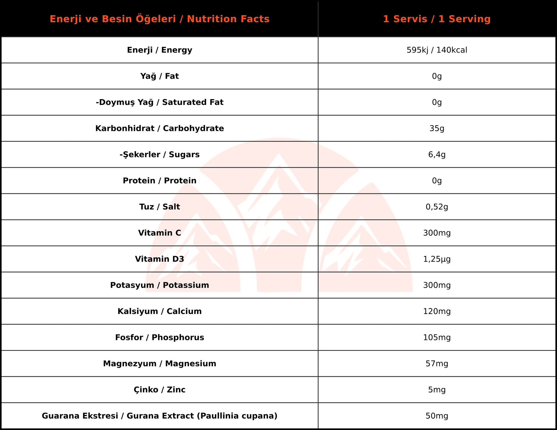 Karbonhidrat Karışımı [Maltodekstrin, Palatinose (İzomaltuloz), Dekstroz], Vitamin ve Mineral Karışımı [Potasyum Klorür, Dikalsiyum Fosfat, Sodyum Sitrat, Kalsiyum Klorür, Magnezyum Sülfat Monohidrat, L-Askorbik Asit, Sodyum Klorür, Çinko Sülfat Monohidrat, Kolekalsiferol], Asitlik DÜzenleyici (Malik Asit), Dekstrin, Portakal Aroma Vericisi (%0,8), Topaklanmayı Önleyici (Silikon Dioksit), Guarana Ekstresi (Paullinia cupana), Tatlandırıcı (Sukraloz), Renklendirici (Beta Karoten)