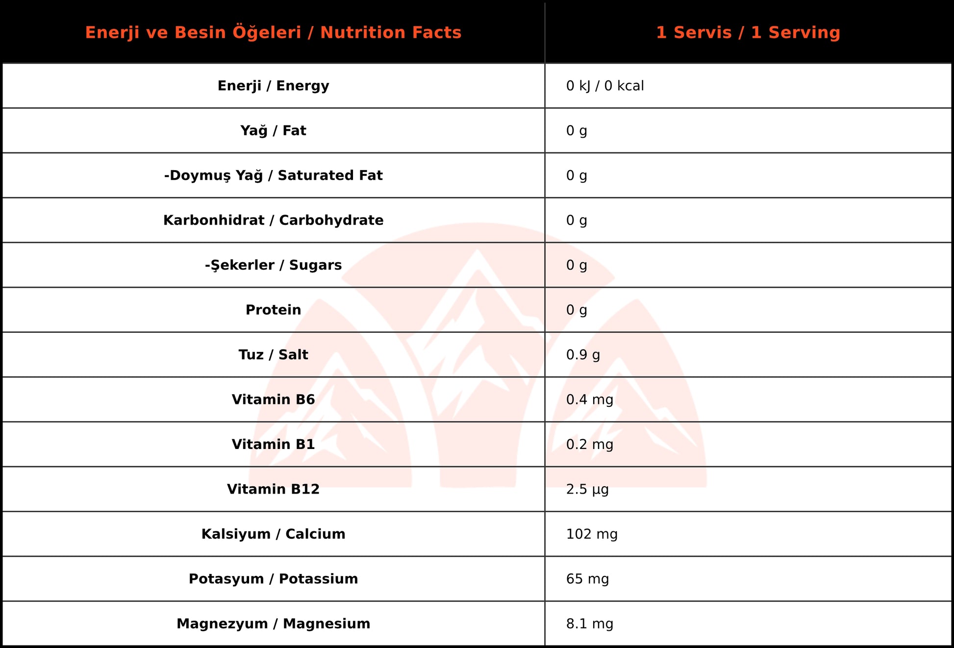 Asitlik Düzenleyici, (Sitrik Asit), Vitamin ve Mineral Karışımı (Sodyum Bikarbonat, Sodyum Klorür, Sodyum Karbonat, Kalsiyum Karbonat, Potasyum Klorür, Trikalsiyum Fosfat, Magnezyum Karbonat, Pridoksin Hidroklorür, Tiamin Hidroklorür, Siyanokobalamin), Hacim Artırıcı (Sorbitol), Orman Meyveleri Aroma Vericisi (%8), Emülgatörler (Polietilen Glikol, Polivinilpirolidon), Tatlandırıcı (Sukraloz), Yeşil Çay Ekstresi (Camellia sinensis), L-lösin, Renklendirici (Pancar Kökü Kırmızısı).