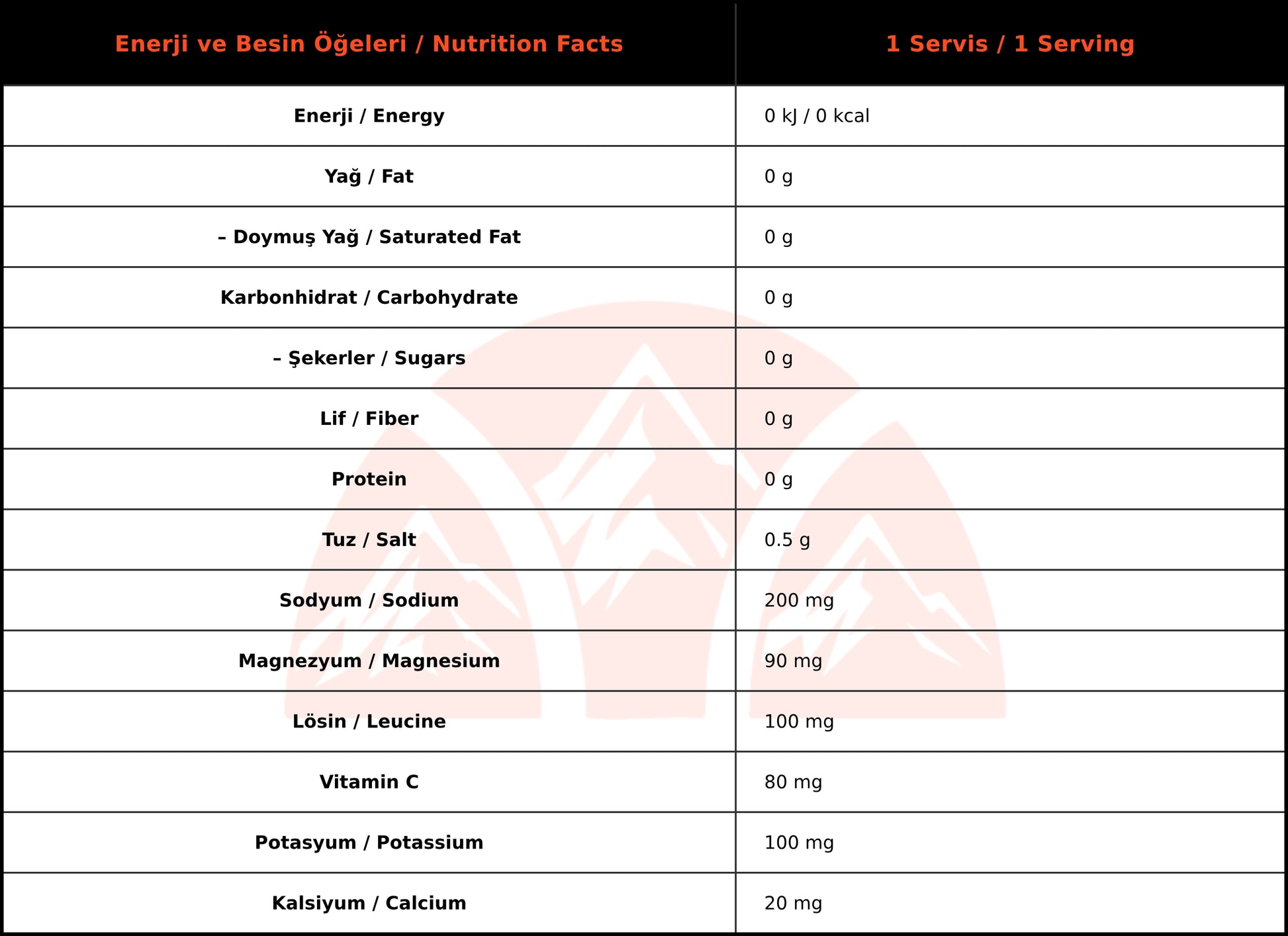 Sitrik Asit (E 330), Sodyum Bikarbonat, Magnezyum Sitrat, Sorbitol (E 420), Potasyum Sitrat, Polietilen Glikol (E1521), Kalsiyum Laktat, Kafein, L-Askorbik Asit, Polivinilprolidin, Limon, Aroma Verici, Renklendirici: Bakır Klorofil, Tatlandırıcı: Sukraloz