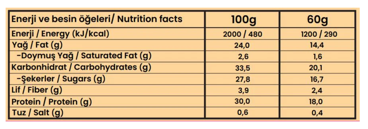 Hurma, Yer Fıstığı, Bezelye Proteini (%25), Nem verici (Gliserol), Karamel Aroması. Doğal olarak şeker içerir, ilave şeker içermez. Renklendirici madde içermez. Eser miktarda susam ve sert kabuklu meyvelerden içerebilir.